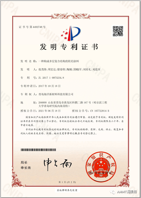 2021年6月18日,青島海洋新材料科技有限公司申請的“一種構成多層復合結構的阻尼涂料”發明專利獲得國家知識產權局授權,授權專利號:ZL 2017 1 0973234.8。目前,公司共獲得國家授權專利32項,其中發明專利30項,實用新型專利1項,外觀設計專利1項。